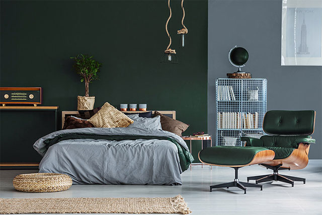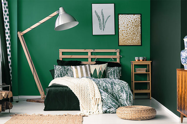 Căn phòng sơn tông màu xanh lá cây theo xu hướng phối đơn sắc tạo nên không gian vô cùng hiện đại, tràn đầy năng lượng, giúp cho bạn mỗi ngày mới đều hứng khởi